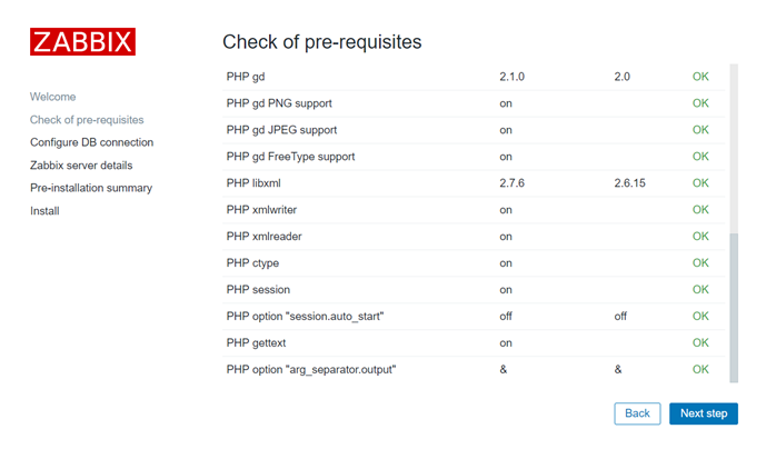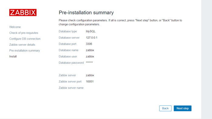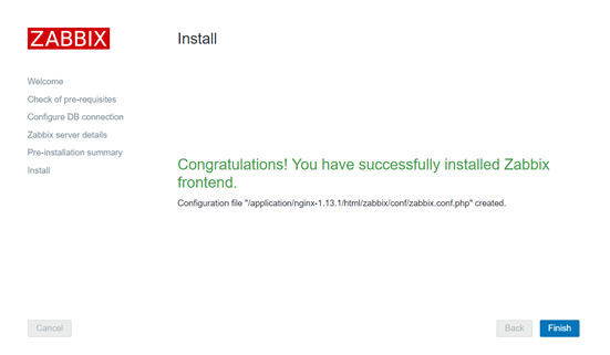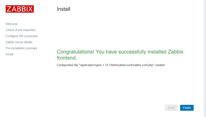 [root@zabbix conf]# ls -lrth 总用量 12K -rw-r--r-- 1 nginx 1000 411 5月 5 22:50 zabbix.conf.php.example -rw-r--r-- 1 nginx 1000 1.1K 5月 5 22:50 maintenance.inc.php -rw-r--r-- 1 root root 415 7月 19 2017 zabbix.conf.php [root@zabbix conf]# chmod 755 zabbix.conf.php #授权根据自己授权的用户 [root@zabbix conf]# chown -R nginx.nginx zabbix.conf.php