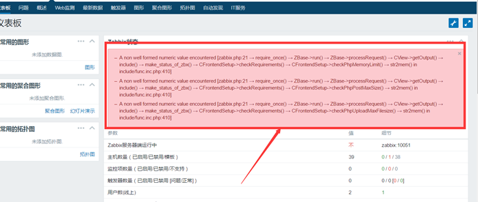 A non well formed numeric value encountered [zabbix.php:21 → require_once() → ZBase->run() → ZBase->processRequest() → CView->getOutput() → include() → make_status_of_zbx() → CFrontendSetup->checkRequirements() → CFrontendSetup->checkPhpMemoryLimit() → str2mem() in include/func.inc.php:410] A non well formed numeric value encountered [zabbix.php:21 → require_once() → ZBase->run() → ZBase->processRequest() → CView->getOutput() → include() → make_status_of_zbx() → CFrontendSetup->checkRequirements() → CFrontendSetup->checkPhpPostMaxSize() → str2mem() in include/func.inc.php:410] A non well formed numeric value encountered [zabbix.php:21 → require_once() → ZBase->run() → ZBase->processRequest() → CView->getOutput() → include() → make_status_of_zbx() → CFrontendSetup->checkRequirements() → CFrontendSetup->checkPhpUploadMaxFilesize() → str2mem() in include/func.inc.php:410]